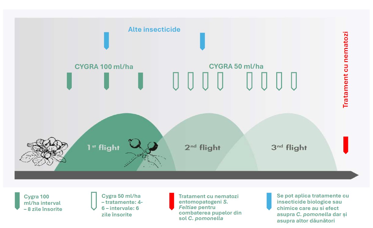 CYGRA® poate fi, de asemenea, combinat cu preparate chimice pentru a preveni riscul ca molia merelor să devină rezistentă la insecticidele chimice. CYGRA® este utilizat în principal la începutul primei generații, iar insecticidele chimice cu acțiune mai rapidă (larvicidele) se aplică după ce vârful curbei de zbor a fost atins.