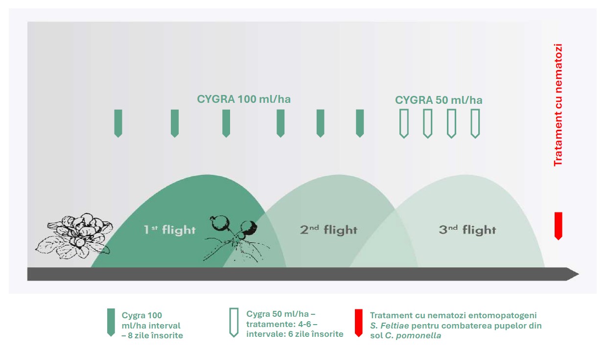 CYGRA® se aplica în conformitate cu indicațiile obținute în urma monitorizării cu ajutorul capcanelor cu feromoni sau a modelelor de predicție regională. Se recomandă să se intervină aproape de ecloziunea ouălor. Prima generație de carpocapsa este cea împotriva căreia se obțin cele mai bune efecte întrucât ouăle carpocapsei vizate nu sunt depuse pe fructe, larva are mai multe șanse de a ingera virusul înainte de penetrare, în timpul „fazei de rătăcire”.